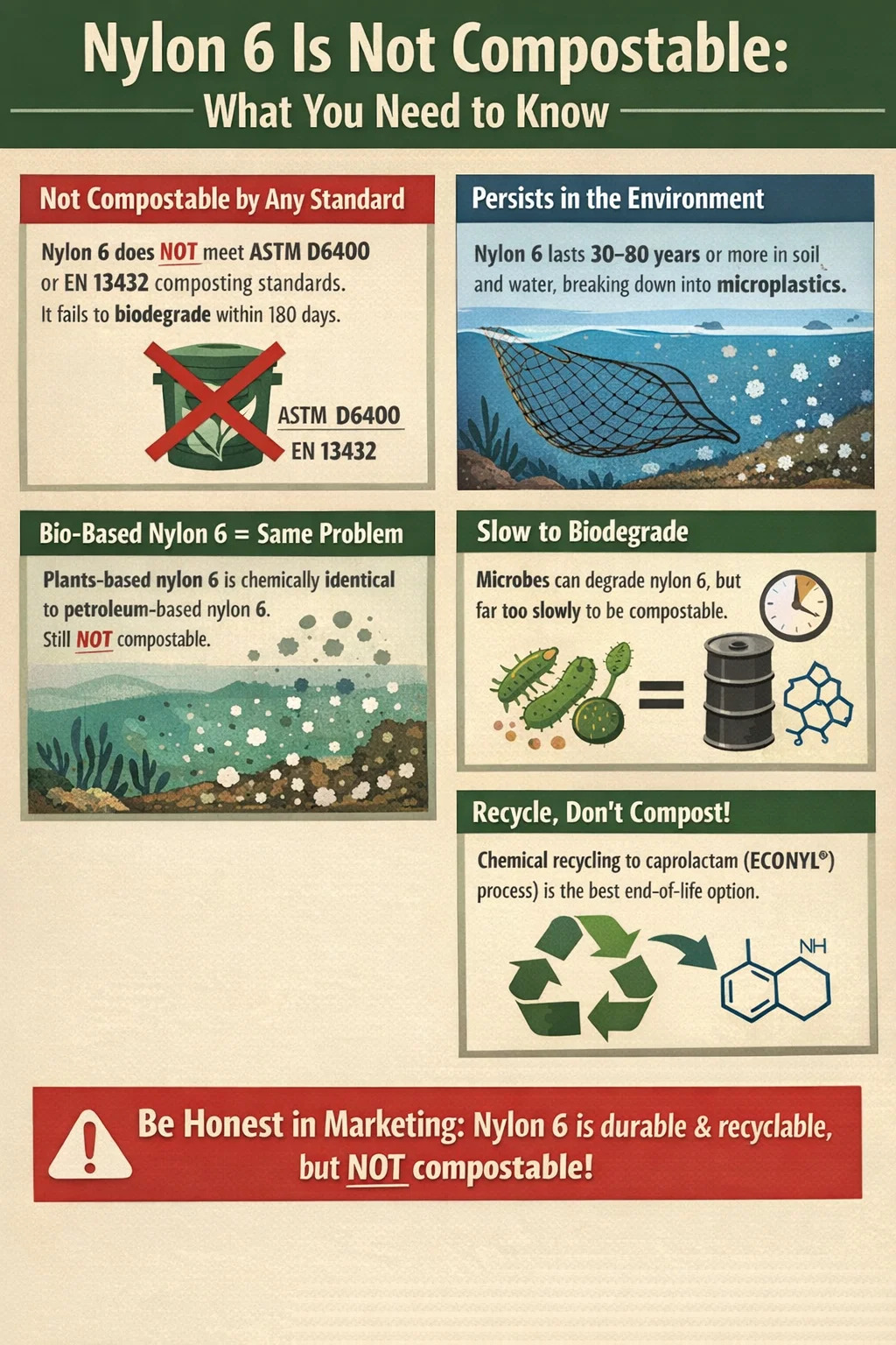 - Yeşil iddialar üzerindeki düzenleyici baskı artıyor; Naylon 6'yı gübrelenebilir veya biyolojik olarak parçalanabilir olarak etiketlemek hatalıdır ve birçok yargı alanında potansiyel olarak yasa dışıdır.