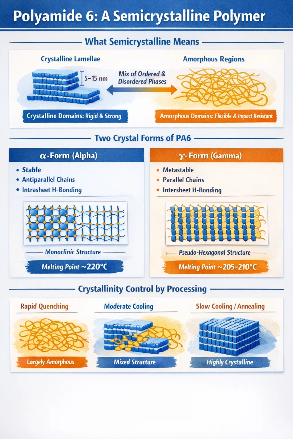Poliamid 6'nın mikro yapısının birçok mühendisi şaşırtan bir yönü, kristalliğinin polietilen gibi daha basit kristalleşebilen polimerlerle karşılaştırıldığında gerçekte ne kadar düşük olduğudur. Eriyik kristalize PA6 tipik olarak %35 veya altında kristallik indeksi işleme koşullarına ve termal geçmişine bağlı olarak. Bu, en uygun yavaş soğuma koşulları altında bile hacimce malzemenin çoğunluğunun amorf kaldığı anlamına gelir.