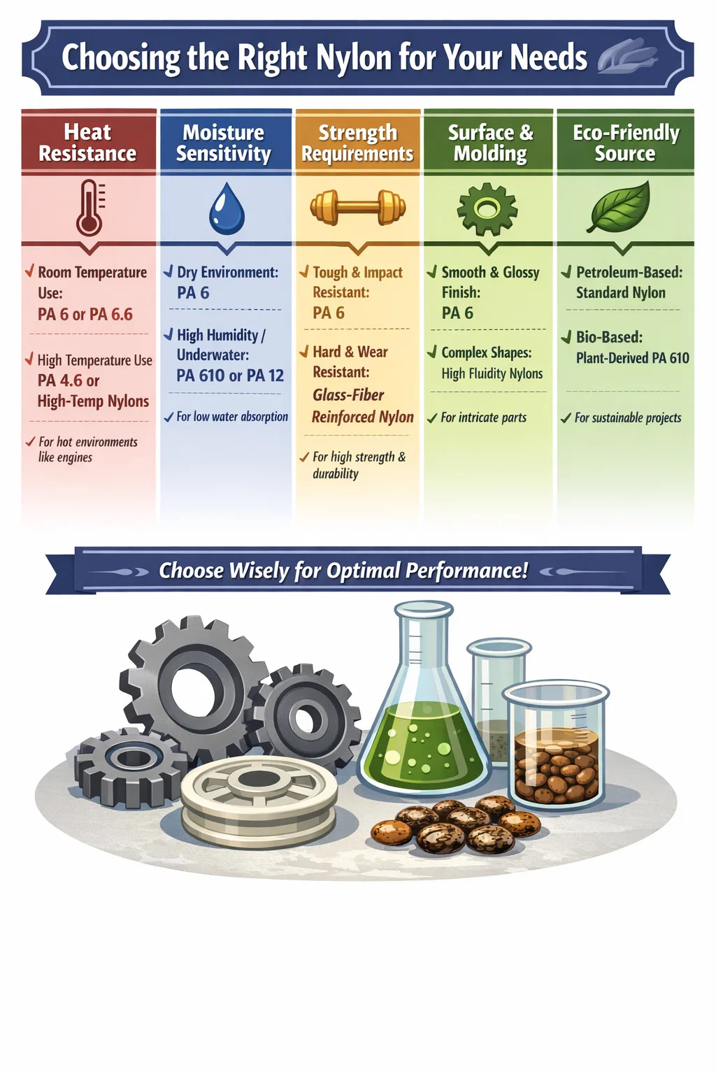 Yeşil kaynak: Ayrıca biyo bazlı naylonlar (PA 610'un bazı bileşenleri gibi) olarak bilinen bitkilerden elde edilen (hint yağı gibi) birçok naylon da vardır. Projeniz yeşili ve çevre korumayı ön plana çıkarıyorsa bu tip poliamid kaynağı daha çekici olacaktır.