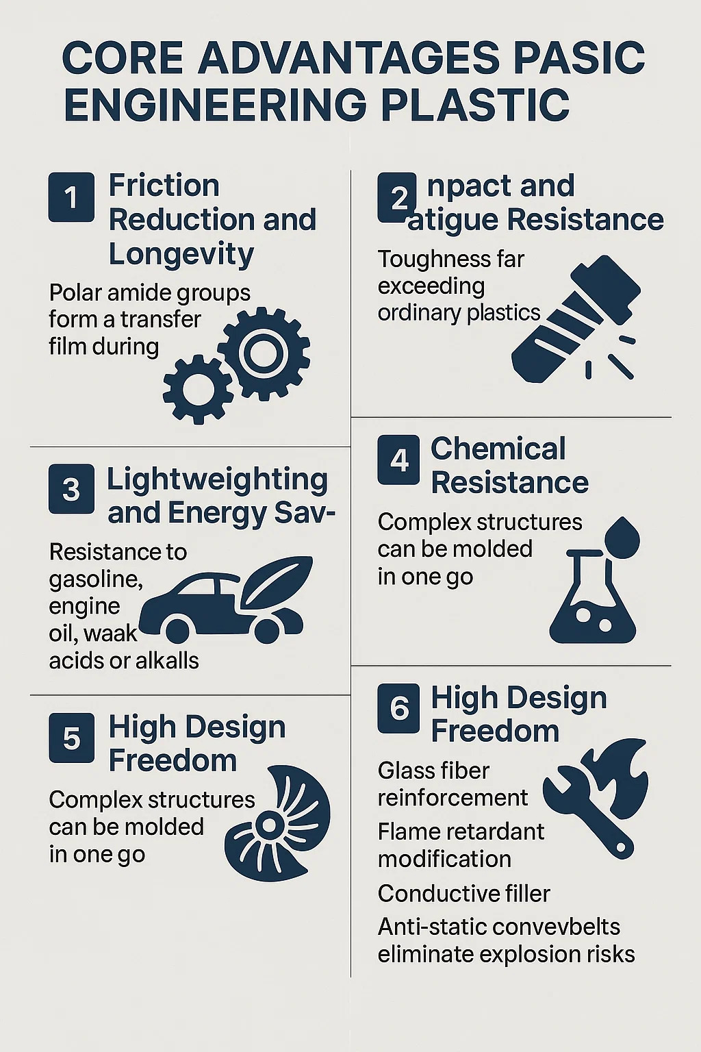 Moleküler zincir, sürtünme sırasında bir transfer filmi oluşturan, dişlilerin ve yatakların harici gres gerekmeden uzun süre çalışmasına izin veren polar amid grupları içerir. Metal iletim bileşenleriyle karşılaştırıldığında, gürültü% 30'un üzerinde azalır ve ömre beş kez uzatılır.