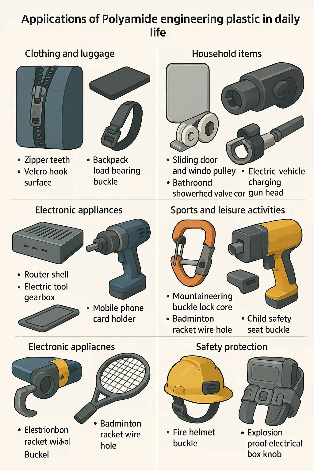 Uygulaması Mühendislik plastik poliamid Günlük yaşamda birden fazla alana nüfuz eder ve çekirdek değeri çeliğin plastikle değiştirilmesinin ve hafif ve dayanıklı olma özelliklerinde yatmaktadır. Belirli tipik senaryolar aşağıdaki gibidir: