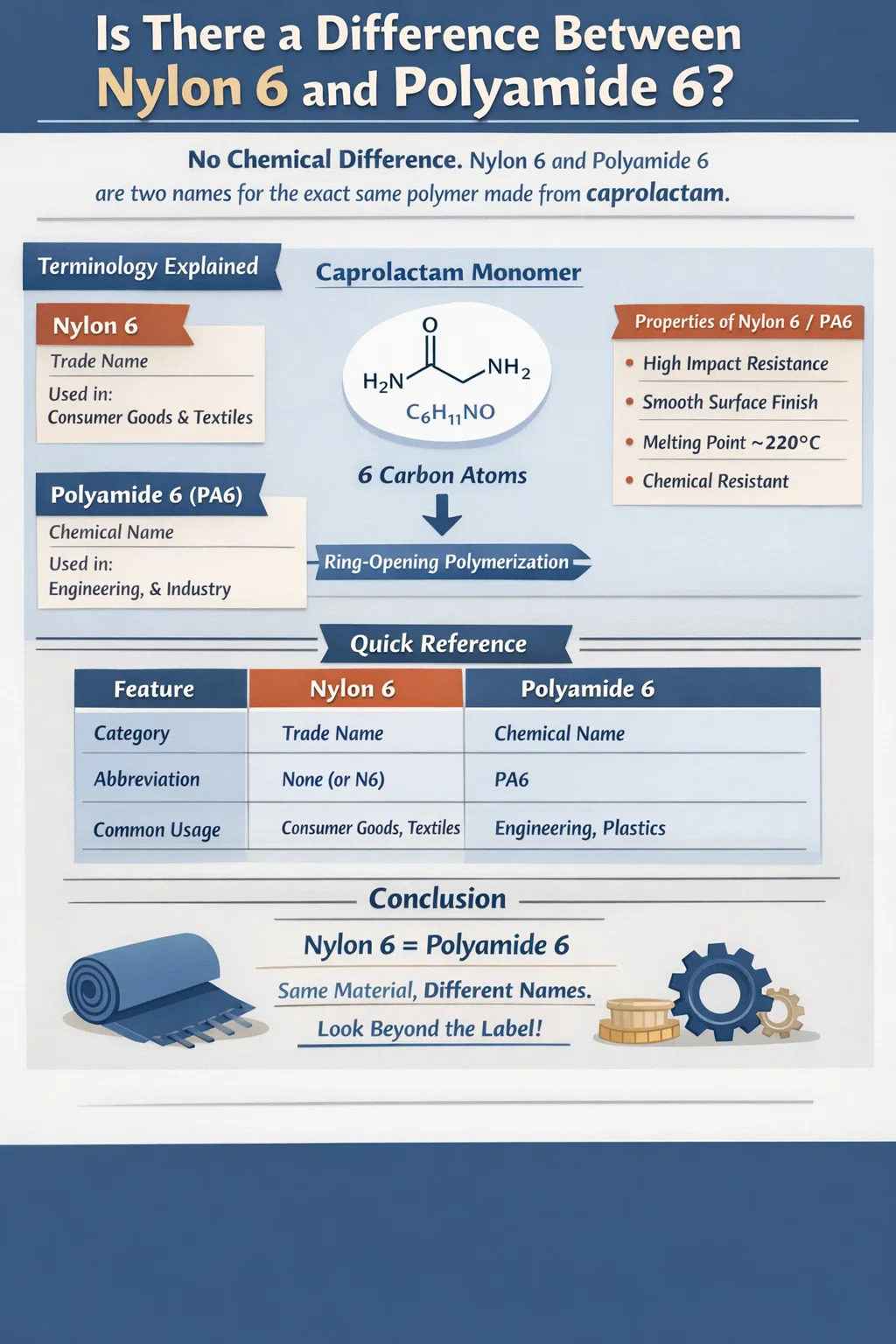 Basitçe söylemek gerekirse: Naylon 6 ile Polyamid 6 arasında kimyasal bir fark yoktur. Bunlar tamamen aynı polimer için iki farklı isimdir. "Naylon", ilk olarak DuPont tarafından türetilen iyi bilinen ticari isimdir; "Poliamid" ise bilim ve mühendislikte kullanılan resmi kimyasal isimdir. gördüğünde Naylon 6 tüketici ürünü etiketinde ve Poliamid 6 Teknik veri sayfasında kaprolaktam monomerlerinden yapılmış aynı malzemeye atıfta bulunuyveyalar.